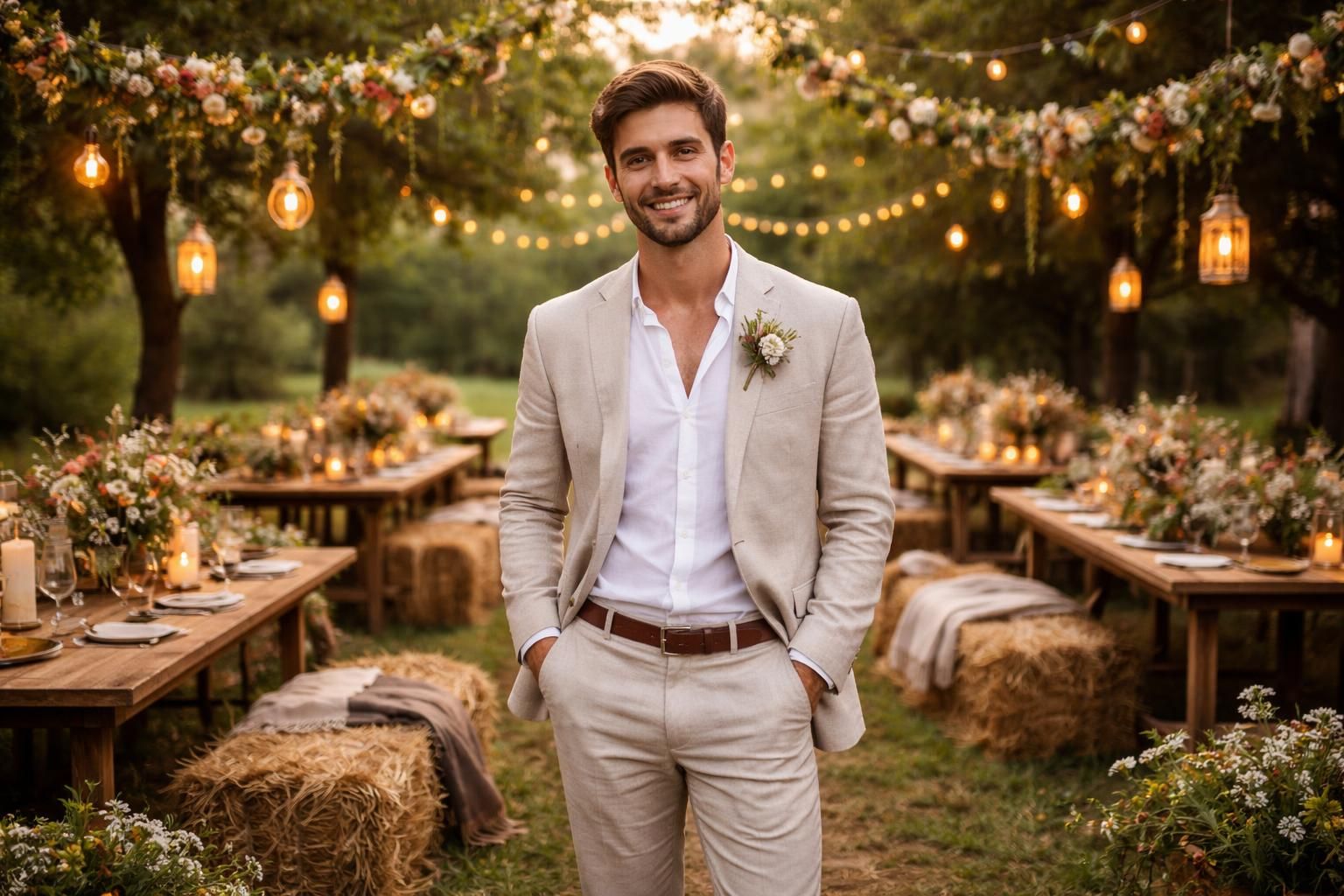 Le vêtement du marié doit également s’harmoniser avec le thème champêtre. L’option d’un costume décontracté en lin ou en coton est de plus en plus prisée. Ce choix non seulement assure un confort maximal, mais renforce également l’aspect naturel et informel du mariage. Une chemise de couleur claire, associée à un nœud papillon ou une cravate en tissu, peut compléter l’ensemble. À noter que les chaussures de type mocassins ou boots en cuir brut ajouteront une touche finale à cette apparence champêtre.