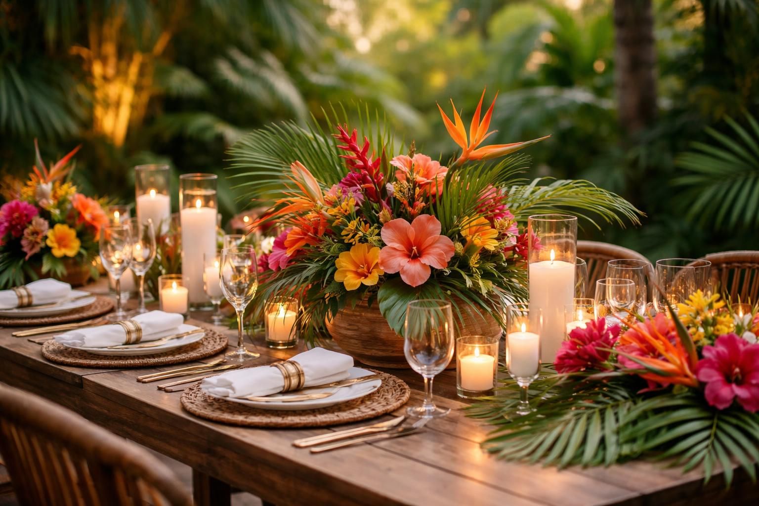 Ajoutez des souvenirs originaux comme des objets artisanaux locaux pour renforcer la connexion au thème tropical et un engagement envers l’environnement. Chaque petit détail participe à l’histoire que vous racontez à travers votre décoration, contributeur d’une ambiance où luxe et nature se rencontrent.